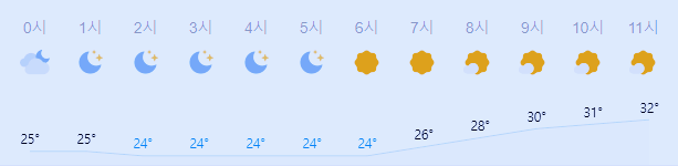 어제와 같은 최저기온이고 어제와 같은 최고기온입니다 아침에 최저기온 영상 24도이고 오후에 최고기온 영상 33도입니다 오전 2시 - 6시 하루 중 최저기온이고 오후 13시 - 14시 하루 중 최고기온입니다