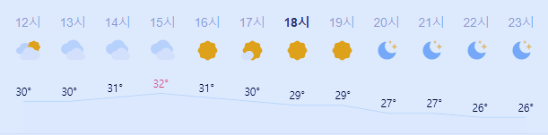 어제보다 1도 높은 최저기온이고 어제보다 1도 낮은 최고기온입니다 아침에 최저기온 영상 25도이고 오후에 최고기온 영상 32도입니다 오전 0시 - 6시 하루 중 최저기온이고 오후 15시 하루 중 최고기온입니다