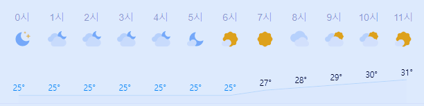 어제와 같은 최저기온이고 어제보다 2도 높은 최고기온입니다 아침에 최저기온 영상 25도이고 오후에 최고기온 영상 34도입니다 오전 0시 - 6시 하루 중 최저기온이고 오후 13시 - 15시 하루 중 최고기온입니다