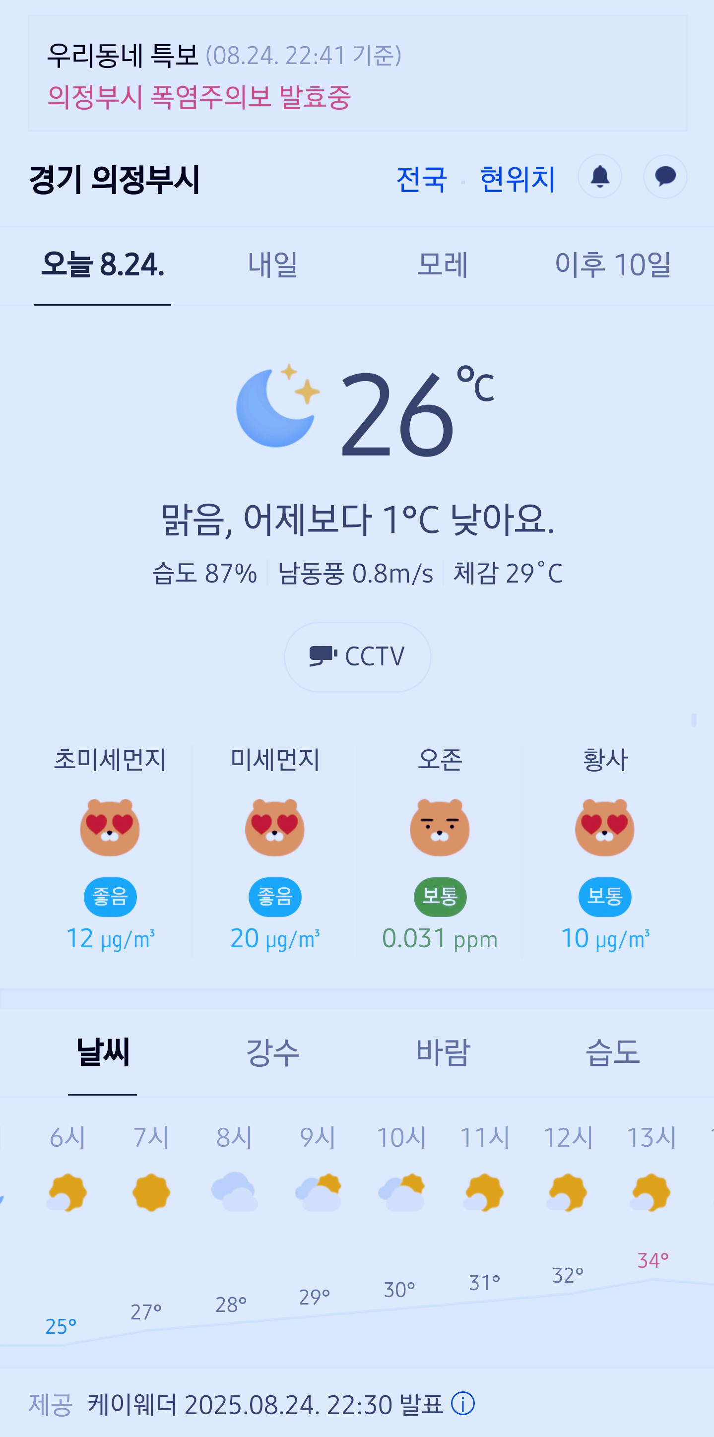 >>>경기도 의정부시 날씨 2025년 8월 24일. 의정부 날씨, 오늘의 날씨, 폭염주의보 발효중, 오늘 날씨, 2025 0824, 초미세먼지, 미세먼지, 황사, 자외선