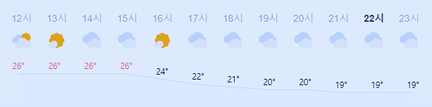 어제보다 1도 높은 최저기온이고 어제보다 2도 높은 최고기온입니다 아침에 최저기온 영상 17도이고 오후에 최고기온 영상 26도입니다 오전 5시 하루 중 최저기온이고 오후 12시 - 15시 하루 중 최고기온입니다