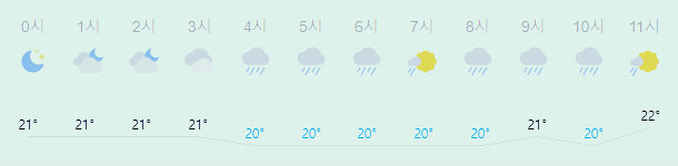 어제보다 2도 높은 최저기온이고 어제보다 3도 낮은 최고기온입니다 아침에 최저기온 영상 20도이고 오후에 최고기온 영상 23도입니다 오전 4시 - 10시 하루 중 최저기온이고 오후 12시 - 18시 하루 중 최고기온입니다