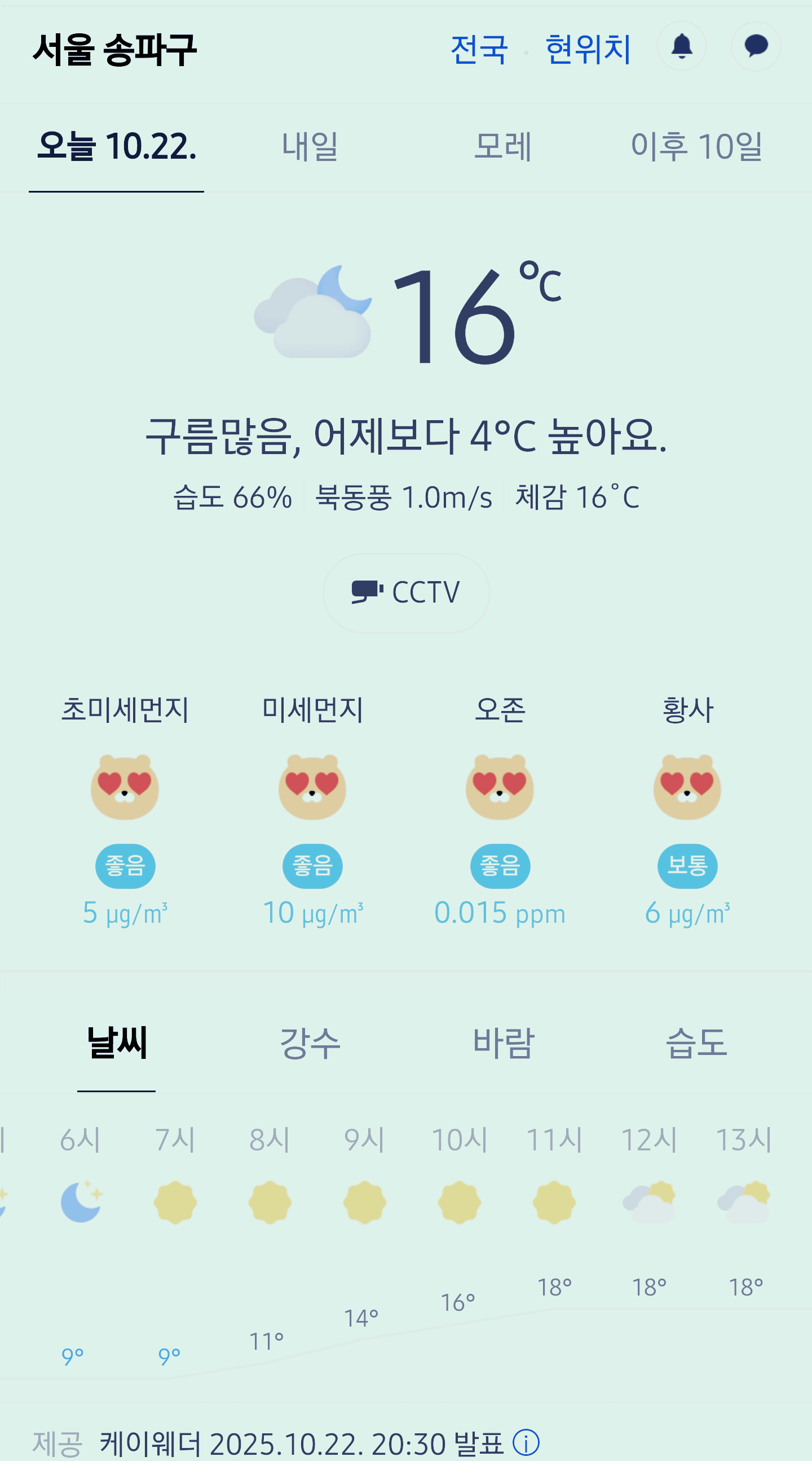 서울 강남 송파구 오늘의 날씨 2025년 10월 22일 (20시 30분 현재)