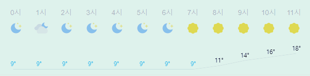 어제보다 2도 높은 최저기온이고 어제보다 3도 높은 최고기온입니다 아침에 최저기온 영상 9도이고 오후에 최고기온 영상 16도입니다 오전 0시 - 7시 하루 중 최저기온이고 오후 15시 - 16시 하루 중 최고기온입니다