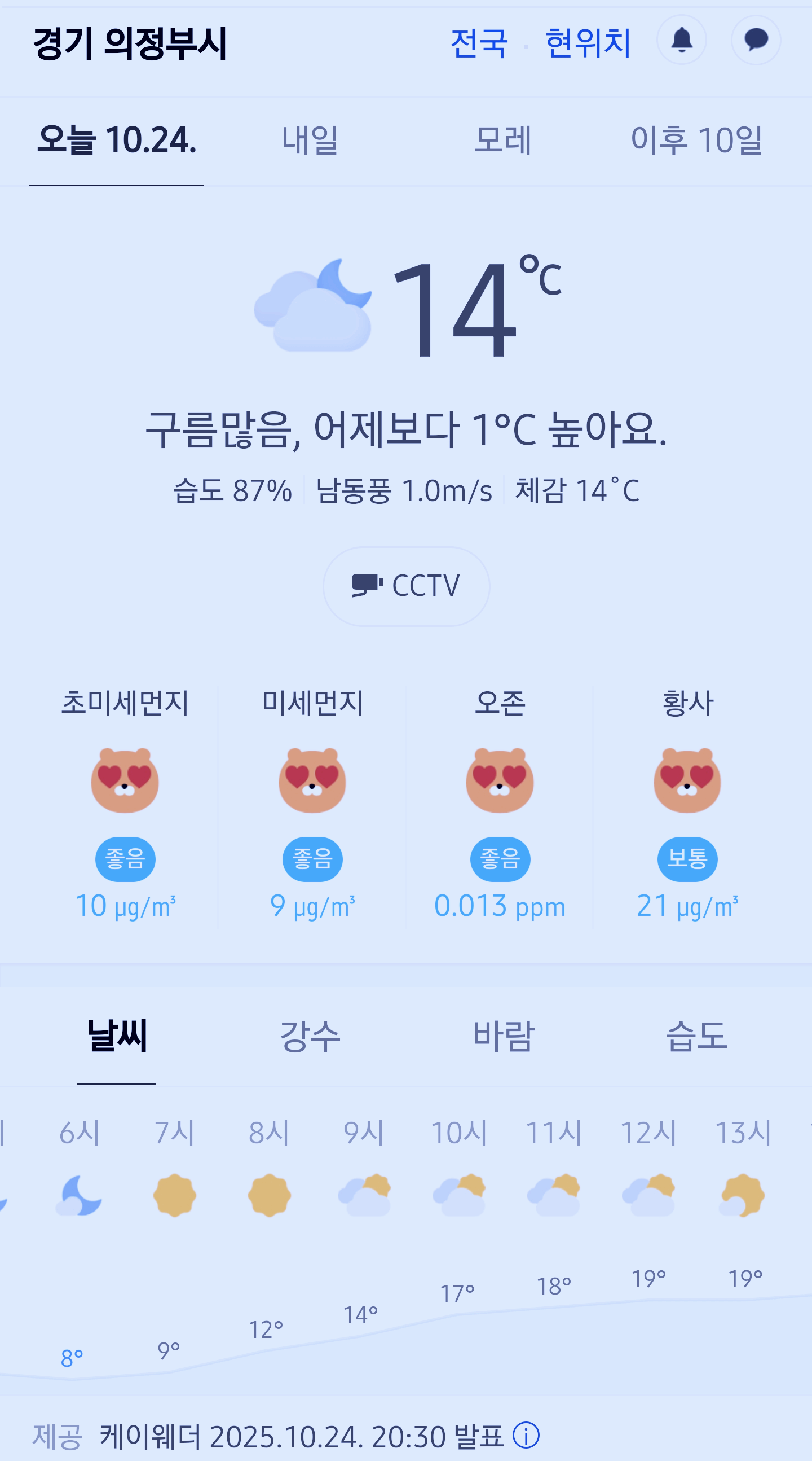 경기도 의정부시 오늘의 날씨 2025년 10월 24일 (20시 30분 현재)