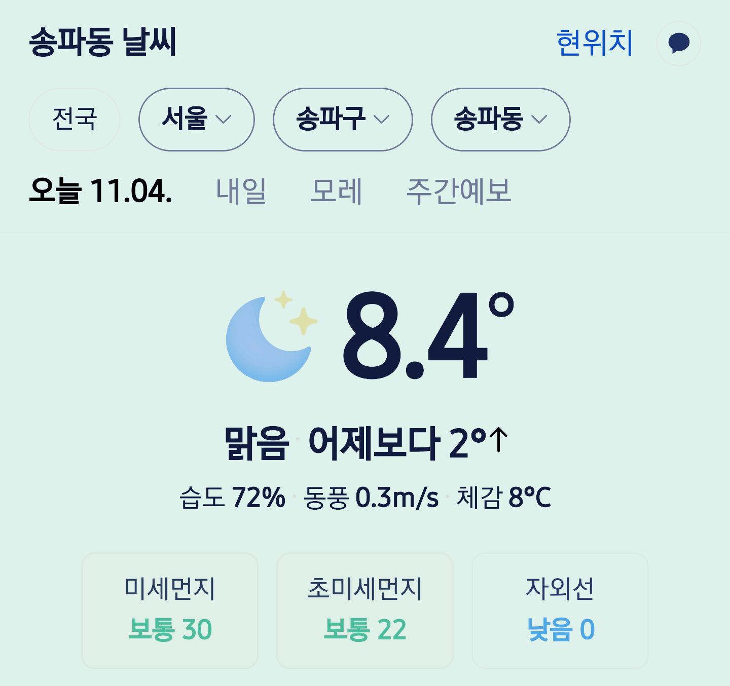 서울 강남 송파구 오늘의 날씨 2025년 11월 4일 (23시 30분 현재)