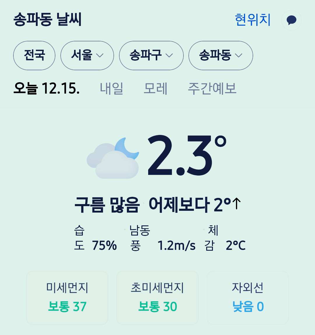 서울 강남 송파구 오늘의 날씨 2025년 12월 15일 (23시 30분 현재)