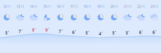 어제와 같은 최저기온이고 어제보다 2도 높은 최고기온입니다 오전 6시 하루 중 최저기온이고 오후 14 - 15시 하루 중 최고기온입니다