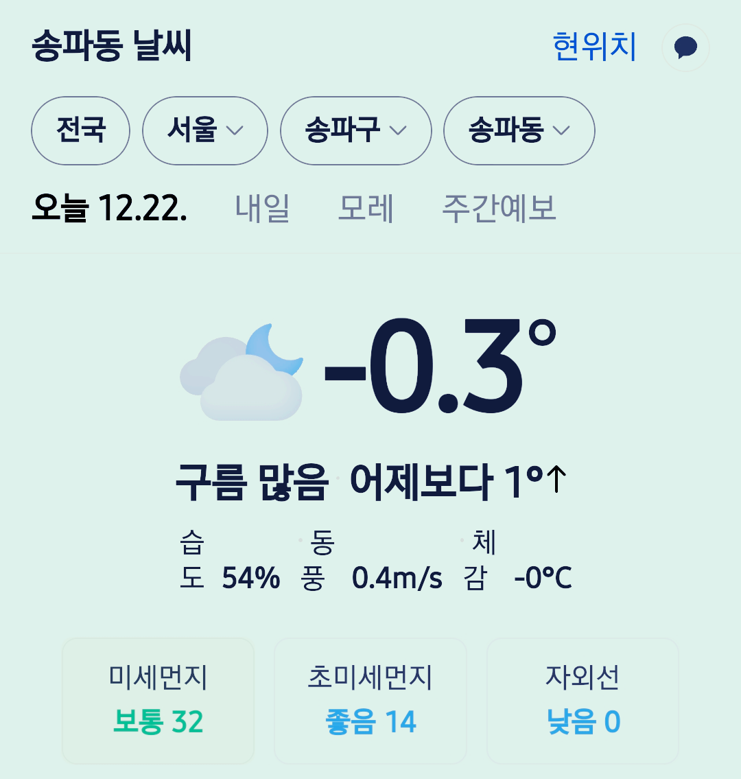 서울 강남 송파구 오늘의 날씨 2025년 12월 22일 (23시 30분 현재)