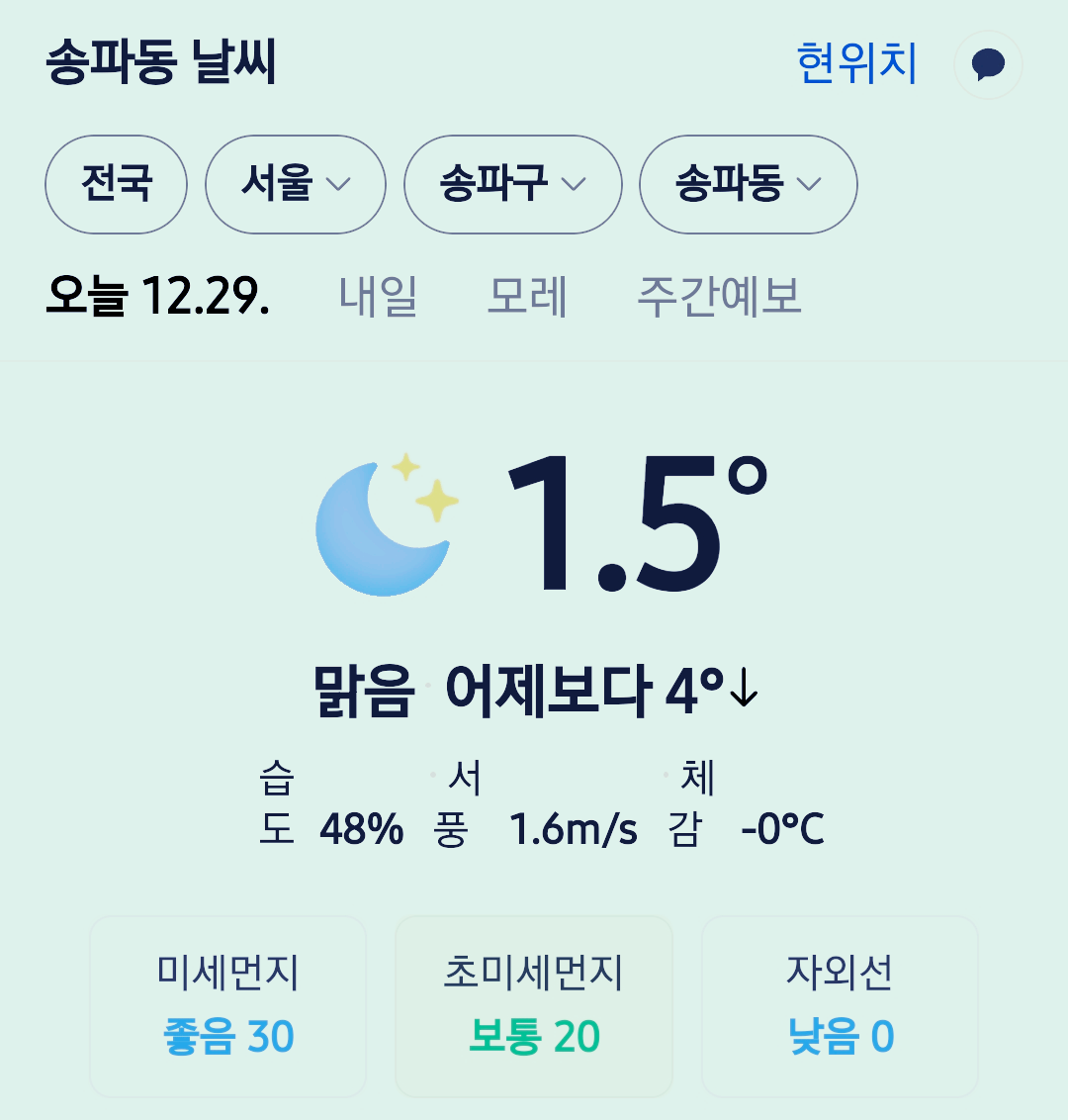서울 강남 송파구 오늘의 날씨 2025년 12월 29일 (23시 30분 현재)