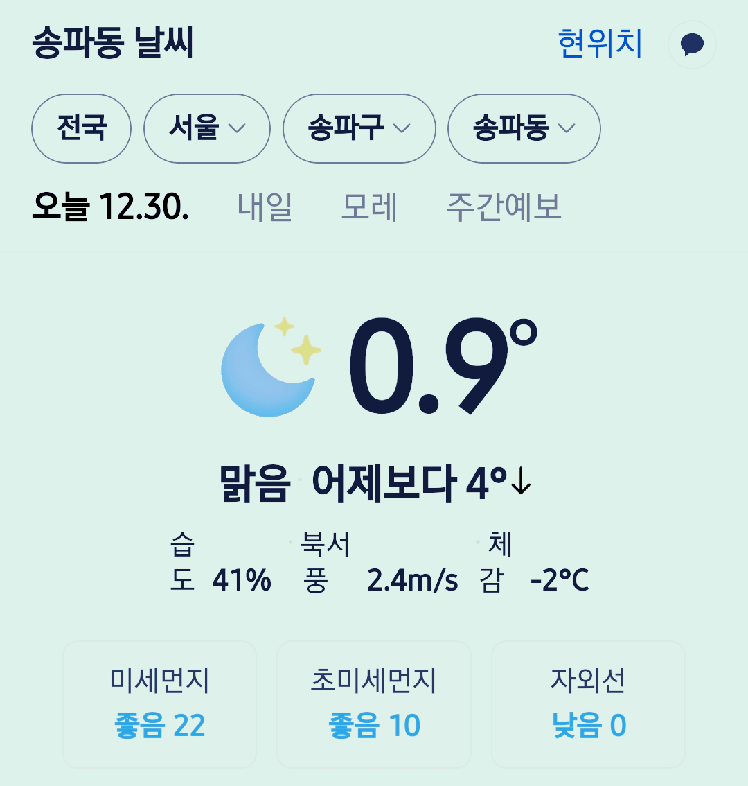 서울 강남 송파구 오늘의 날씨 2025년 12월 30일 (20시 30분 현재)