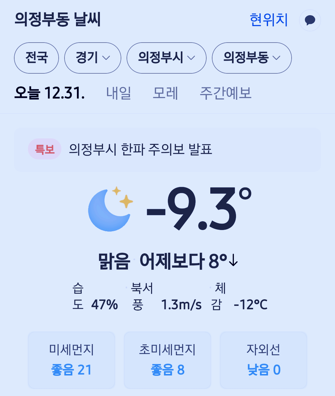>>>경기도 의정부시 날씨 2025년 12월 31일. 의정부 날씨, 한파주의보 발효중, 오늘의 날씨, 오늘 날씨, 2025 1231, 초미세먼지, 미세먼지, 황사, 자외선
